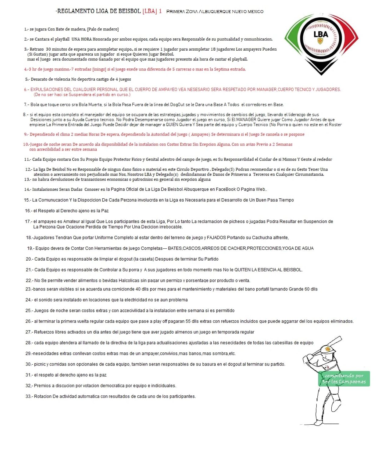 -Aplica para todo aquel involucrado en el beisbol regional llanero estilo mi Rancho, Por Algo es El Rey De Los deportes ( ACUERDOS SERAN APLICADOS POR MANAGERS Y DIRECTIVOS, Y O DELEGADOS DE LBA [1] Liga de Beisbol Albuquerque en juntas previas a torneo Regular De Verano.